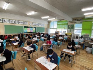 今日は、国語と社会が行われました。子どもたちはみんなとても真剣に取り組んでいました。明日は、算数、理科、そして5,6年生は英語も行われます。