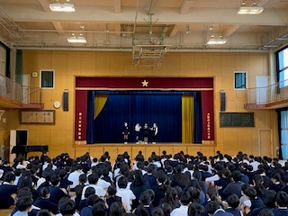 今朝の児童集会は「楽器当てクイズ」でした。集会委員会の子たちが鳴らした楽器のメロディを聴いて楽器の名前を当てました。聴いたことのある音でも名前を当てるのはなかなか難しかったです。