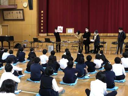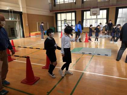 また、アイマスク体験では、目の見えない役とサポート役の2つを体験しました。サポート役の児童は、どのように声をかけ、歩いたらよいかを教えてもらい、ペアの児童が安心して歩くことができるようにサポートをしていました。