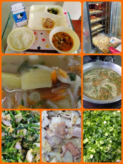 『さつまいものみそ汁』は、にぼしでだしをとり、鶏肉、さつまいも、にんじんもやし、青ねぎを使用しています。『きくなとはくさいのごまあえ』は、旬のきくなとはくさいをゆでて砂糖、うすくちしょう油で作ったタレをかけ、いりごまをふりあえています。豚肉のしょうが焼きといっしょに美味しく頂きました。