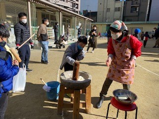 つきたて餅のテーブルには、長蛇の列ができていました。順番に餅をつく体験ができ、子どもたちも楽しそうに参加していました。早朝より準備等ご協力いただきました皆様ありがとうございました。