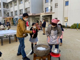 18日(日)の午前中、運動場で、福島地区活動協議会主催の「もちつき大会」が行われました。かなり寒い日でしたが、多くの方々が参加され大盛況でした。