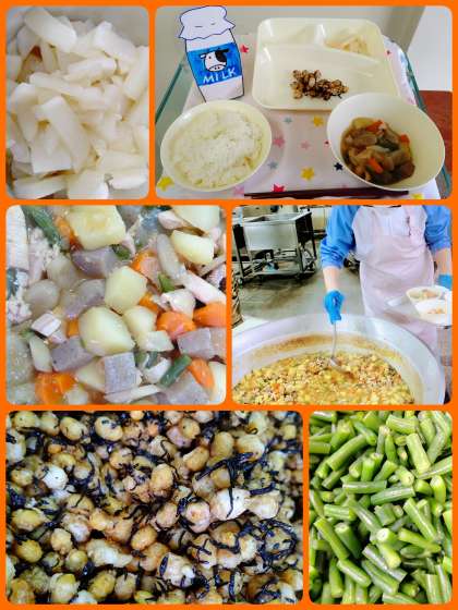 今日は、2学期最後の給食です。和風献立でした。『ひじき豆』は、油であげた大豆に、ひじきが入った調味液をからませています。児童に人気の献立です。『かぶのゆず風味』は、冬が旬のかぶを蒸し、さっぱりとしたゆず風味の調味液をかけ、あえています。鶏肉と野菜の煮ものと一緒に美味しく頂きました。
