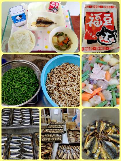 今日は、節分の行事献立です。『いわしのしょうがじょうゆかけ』は、料理酒で下味をつけた開きのいわしを焼き、しょうが風味のタレをかけています。臭みもなく骨までやわらかくて美味しかったです。『含め煮』は、豚肉を主材に、じゃがいも、だいこん、にんじん、ごぼう、しめじ、三度豆を使用しています。冬が旬のだいこん、ごぼうは、食物繊維が豊富な野菜です。「いり大豆」が1人1袋ずつつきます。
