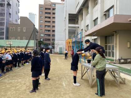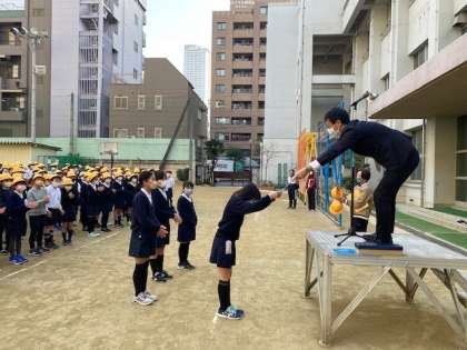 今朝の児童朝会は運動場で行われました。キックベースボールチームやバレーボールチームの子たちの表彰が行われました。