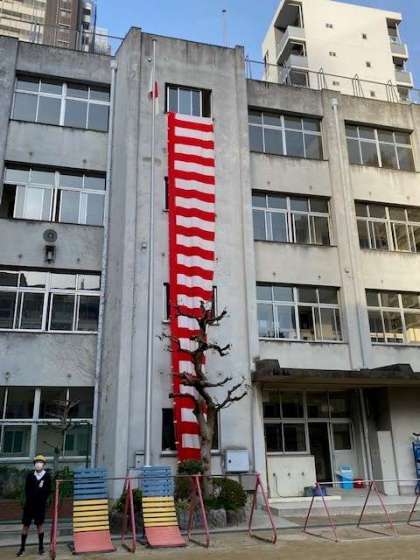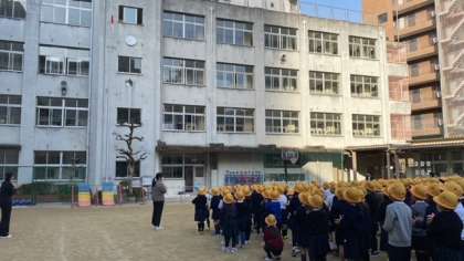 朝会の後、創立120周年記念として福友会から贈られた新しい校章と時計を披露しました。子どもたちからは「わー」っと歓声が上がっていました。