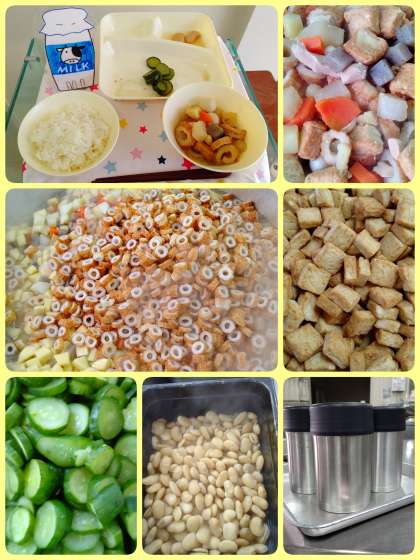 『関東煮』は、鶏肉、うずら卵、ちくわ、こんにゃく、厚揚げ、だいこん、にんじんを使用しています。卵アレルギーの児童も食べる事ができるよう、うずら卵を使用しない個別対応献立となっています。福島小学校では、個別に保温ポットに入れて配缶します。『白花豆の煮もの』は、鉄や食物繊維が多く含まれています。ほんのり甘くてやわらかく美味しかったです。