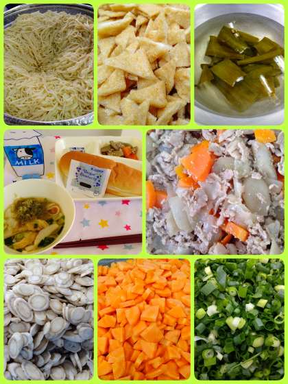 『豚肉とごぼうの煮もの』は、豚肉とごぼう、玉ねぎ、にんじんを甘辛く煮ています。『なにわうどん』は、甘辛く煮たうすあげとかまぼこ、はくさい、青ねぎを使用し、だしの旨みを味わうことができるようにシンプルに仕上げています。教室でとろろ昆布を1人1袋ずつ入れていただきます。