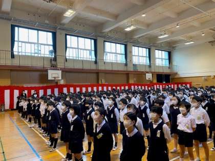 生活指導の先生から、春休みの生活について「いかのおすし」のことばを使い、安全第一で過ごしてほしいというお話がありました。最後は元気な声で校歌を歌いました。
