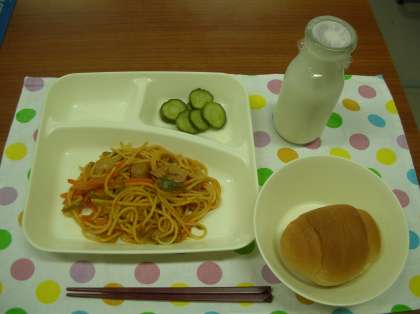 今日は、子ども達に大人気の「イタリアンスパゲッティ」でした。ウインナーと豚肉を使ったトマトケチャップ味のスパゲッティです。ほとんどのクラスが食缶を空っぽにしていました。