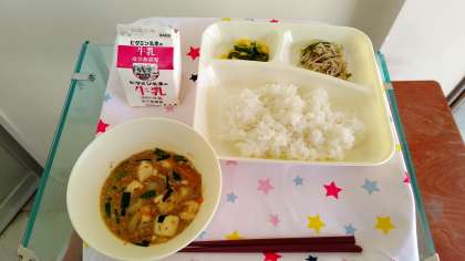 『マーボーどうふ』は豆板醬やしょうが、にんにくを炒め、ひき肉、とうふ、たまねぎ、にんじん、にらを炒めた中国の豆腐料理です。ごはんがすすむ献立で美味しかったです