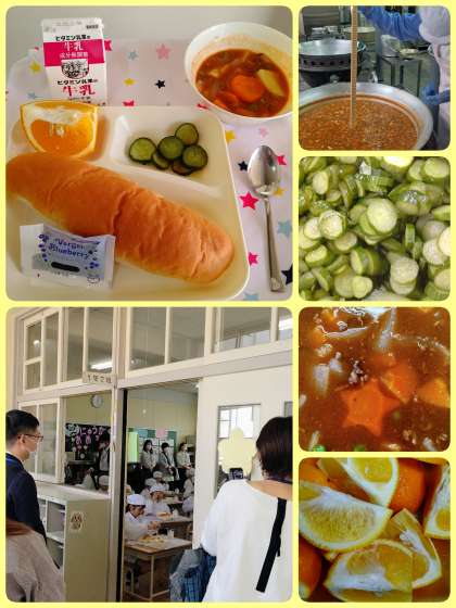『ビーフシチュー』は小麦粉と綿実油で作ったルウを使用した、毎回児童に好評な献立です。今日は、ハート、星、お花、等の形をしたにんじんが入ったラッキーにんじんの日でした。1年生の給食参観は、たくさん保護者の方が見に来られていました。