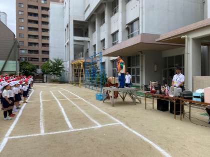 全体練習の前に、「フッピー隊」の方が来られました。「フッピー隊」は、登下校の見守りや校内巡視、校区の安全パトロールをしてくださっています。オレンジのベストが目印です。「こども110番の家」の紹介もしてくださいました。