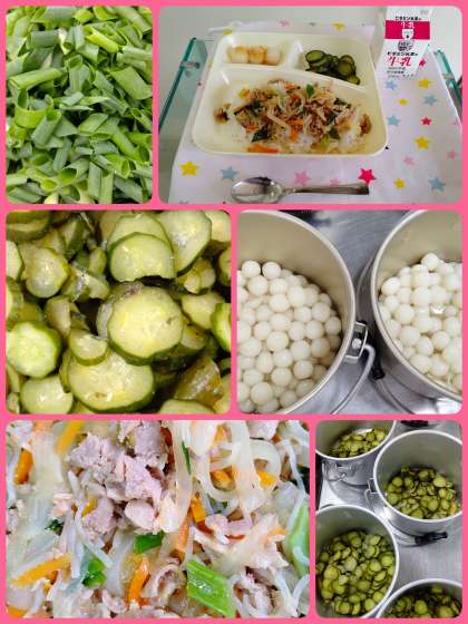 『豚丼』は、豚肉を主材に糸こんにゃく、玉ねぎ、にんじんを使用し炒めだしで煮ています。ごはんに合う味つけで美味しかったです。『白玉だんごのきな粉がけ』は、白玉だんごにタレをからませています。喫食時にきな粉をまぶして食べます。おかわりをする児童がたくさんいました。