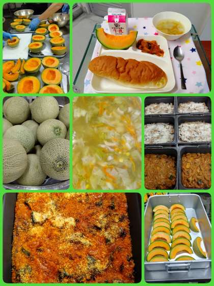 かぼちゃのミートグラタン 鶏肉と野菜のスープ クインシーメロン おさつパン 牛乳