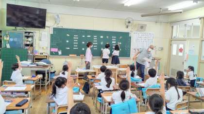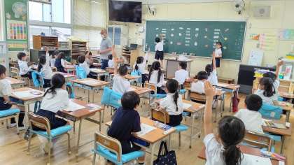 今日は、1年生初めての食育授業がありました。玉川小学校から栄養教諭の瀧本先生が来てくださいました。テーマは『たべもののなまえをおぼえよう』です。食べ物博士になって名前をたくさんおぼえました。