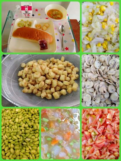 いかてんぷら フレッシュトマトのスープ煮 キャベツとコーンのソテー コッペパン いちごジャム