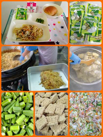 『和風焼きそば』は、豚肉、いかを主材に使用したしょうゆ味の焼きそばです。児童に人気の献立です。『オクラの甘酢あえ』は、甘酸っぱい風味が口の中にひろがります。黒糖パンといっしょに美味しく頂きました。