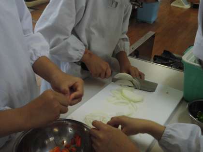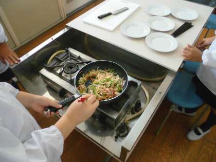6月13・14・15日に6年生初めての調理実習をしました。野菜の切り方や炒める順番を確認しながら「いろどりいため」を作りました。安全に気を付けて、おいしく出来上がりました。