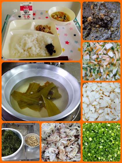 『豚肉の甘辛焼き』は、豚肉に下味をつけ、玉ねぎを混ぜ合わせて焼いています。『五目汁』は、旬のたけのこ、かまぼこ、うすあげなどを使用した汁ものです。『のりのつくだ煮』は、しいたけ、きざみのりを使用した調理員さん手作りのつくだ煮です。ごはんによく合う一品です。