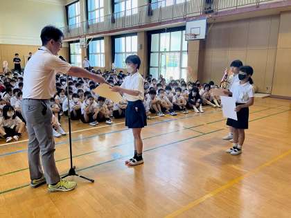 今朝は全校が集まって児童朝会を行いました。校長先生からは暑さに関するお話がありました。そして、バレーボールの表彰もありました。