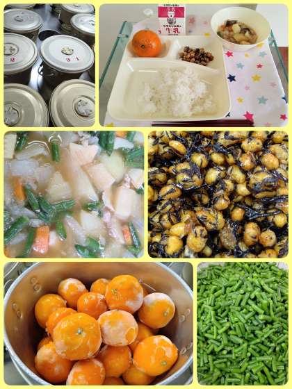 『鶏肉と野菜の煮もの』は、鶏肉を主材に、たけのこ、しいたけ、三度豆などを使用したうま味たっぷりの煮ものです。『ひじき豆』は、でん粉をまぶしてあげた大豆に、ひじきが入った甘辛い調味液をからませています。児童に人気の献立です。今日は、『冷凍みかん』が登場しました。夏がきたなぁと感じる献立でした。