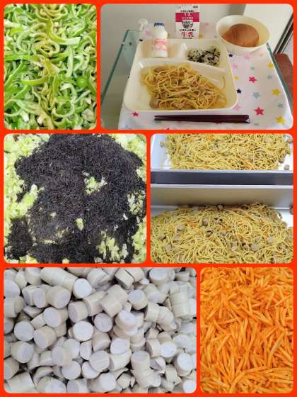 『チキンスパゲッティ』は、鶏肉、ウインナーを主材に、バジル風味のスパゲッティです。『キャベツのひじきドレッシング』は、蒸したキャベツにひじき入りのドレッシングをかけ、あえています。パンによく合う献立で美味しかったです。