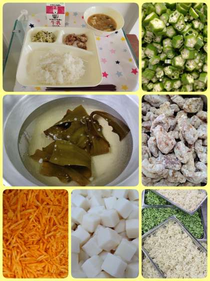 『豚肉のたつたあげ』は、しょうが汁、料理酒、こい口しょう油で下味をつけ、あげています。児童に人気の献立です。『切り干し大根のゆずの香あえ』は、きゅうり、切り干し大根を蒸し、ゆず風味のタレをかけ、あえています。さっぱりとした味つけです。1学期最後の給食も美味しかったです。