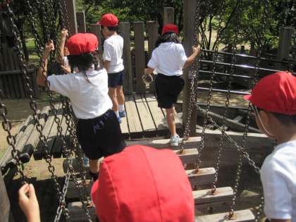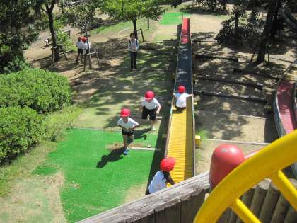 2日(金)に秋の遠足で元浜緑地へ行きました。天候に恵まれ、青空の下、元気いっぱい遊びました。長いすべり台を一緒にすべったり、どんぐりやきれいな色の落ち葉もたくさんみつけたりすることができました。みつけた秋は生活科で学習していきます。