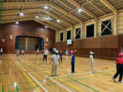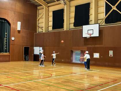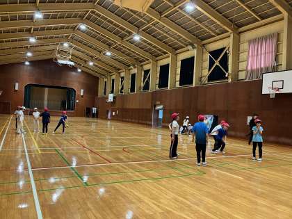 雨が小降りになったタイミングで移動し、学級ごとに体育館で室内運動をしたり、ボルダリングを楽しんだりしています。