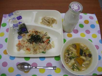 かやくごはん、みそ汁、もやしの甘酢あえ、牛乳
