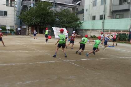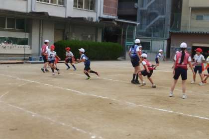 最初は,キャッチボールをしました。楕円形のボールに手こずりながらも,どんどん上達していきました。次は,走りながらボールをキャッチしました。難しくてなかなかうまく取れなくても,笑顔の5年生。最後に,ボール運び鬼をしました。フラッグを取られないように作戦を立てて,ゴールを目指しました。
