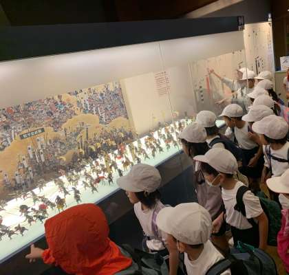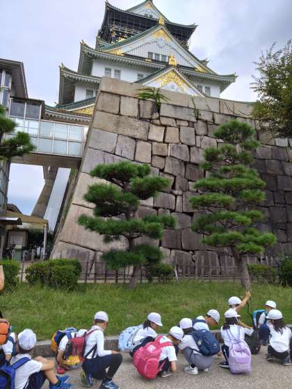 秋の遠足に行ってきました。大阪城を囲む大きな石の壁を見て、「どうやって運ぶんだろう。」と不思議に思っていると、あっという間に大阪城の真下に辿り着いて、その迫力にびっくり。お城の中では、大阪城の歴史や江戸時代にまつわる展示を見て回りました。
