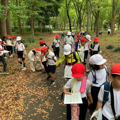 楽しみにしていた弁当を食べた後は、1,2年生合同で秋見つけ。秋の福島ビンゴを完成させようと、協力して秋を探していました。