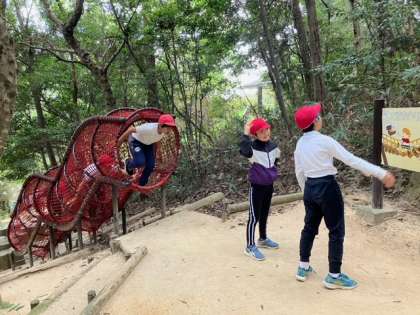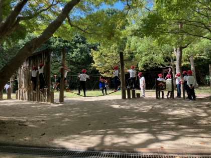 お弁当の後はアスレチックで体を動かしています。1周目は班で回り、2周目以降は気に入ったものを何回もしたり、何周も回ったりして、時間の限り楽しんでいます。