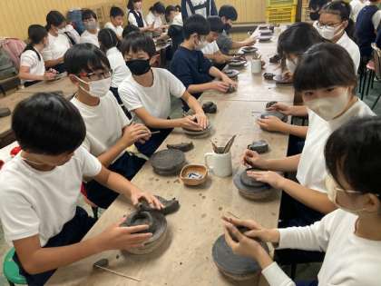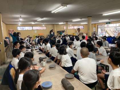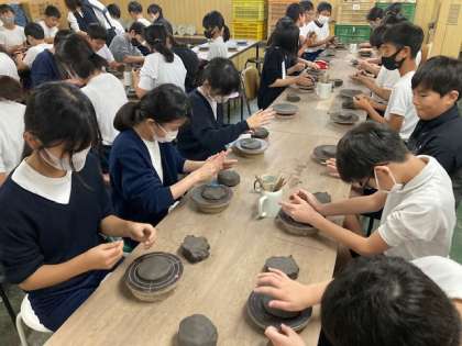 続いて、陶芸体験をスタートしました。子どもたちはワイワイと楽しそうに、粘土をこねています。