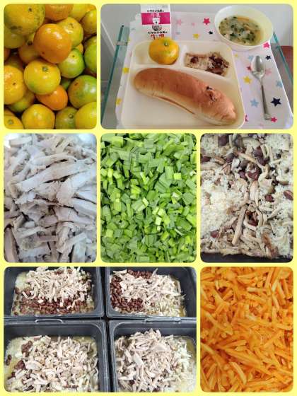 『金時豆の中華おこわ』は、もち米に焼き豚、金時豆(ドライパック)しめじを加えて蒸し焼きにしています。『中華スープ』は、鶏肉、たけのこ、とうふ、にらなどを使用した中華風味のスープです。みかんが1人1個ずつ付きました。パンは久し振りにレーズンパンがでました。どの献立も美味しかったです。