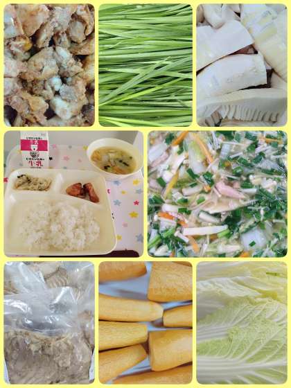 『鶏肉のチリソース焼き』は、鶏肉にしょうが汁、にんにく、ケチャップ、トウバンジャン等で下味をつけ、焼いています。ケチャップの甘酸っぱさとトウバンジャンのピリ辛があい美味しかったです。『焼き豚とワンタンの皮のスープ』は、焼き豚を主材に、ワンタン、ぐだくさんの野菜を使用したスープです。ごはんがすすむ献立でした。
