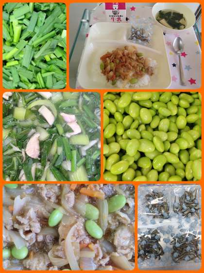 『ピリ辛丼』は、豚肉を主材に、玉ねぎ、にんじん、むき枝豆使用し、赤みそで味つけし、トウバンジャンで辛味をつけた彩のよい丼ぶりです『中華スープ』は、鶏肉、たけのこ、チンゲンサイ、にらを使用した具だくさんのスープで美味しかったです。