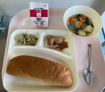 黒糖パン・牛乳・野菜のソテー・鶏肉のガーリック焼き・スープ煮