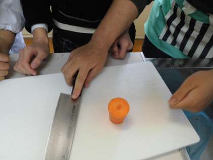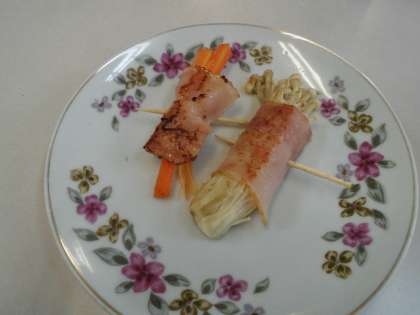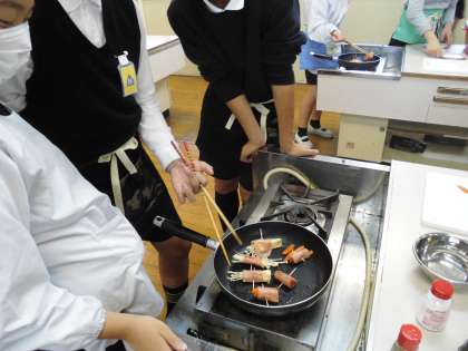 6年生は調理実習で、野菜のベーコン巻きを作りました。にんじんとえのきたけをベーコンで巻いて、焼いて食べました。調理実習にも慣れてきたようで、だんだんと手際が良くなってきていました。また、今回の調理実習では、家庭科の学習で制作したエプロンを着用しました。簡単に作れるので、お家でもぜひ作ってみてほしいと思います。