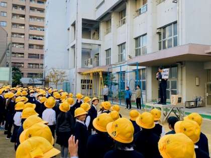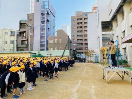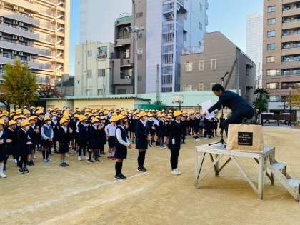 今朝、運動場で児童朝会がありました。最初にバレーボールチームの表彰式がありました。校長先生からは「人権週間」についてのお話がありました。生活指導の先生からは、きまりを守ること、特に廊下階段の正しい歩行の仕方についてお話がありました。