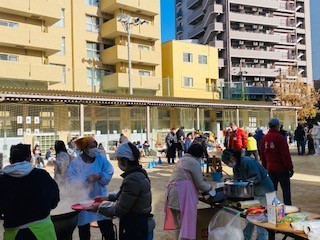 みんなつきたての「きな粉もち」「大福もち」「よもぎもち」などに舌鼓をうちました。また、暖かい「豚汁」や綿菓子もご用意いただき、みんなでおいしくいただきました。
