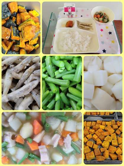 きびなごてんぷら 含め煮 焼きかぼちゃの甘みつかけ ごはん 牛乳