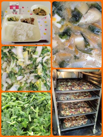 『きくなとはくさいのごまあえ』は、旬のきくなとはくさいを合わせたごま風味のおひたしです。『みそ汁』は、にぼしでだしをとった、具だくさんのみそ汁です。にぼしでとったおだしには、骨の成長を助けてくれる栄養素がたくさん含まれているそうです。