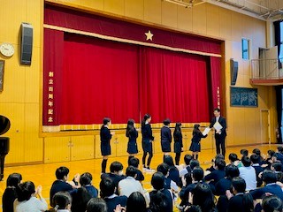 本日(10日)3学期の始業式を行いました。はじめに、学級代表の児童が、冬休みの思い出や3学期の目標などを発表しました。冬休みならではの楽しい行事の話や、新しい年への意気込みが感じられる話が聞かれました。どの児童も休み中にしっかり練習したようで、とても上手に発表していました。今日は読書感想文の表彰もありました。校長先生のお話の後、みんなで元気よく校歌を歌いました。