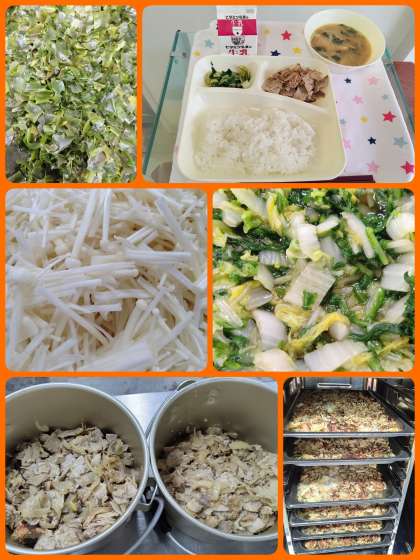 『豚肉のごまだれ焼き』は、豚肉にねりごま、砂糖、みりん、こい口しょう油でで下味をつけ、玉ねぎを混ぜ合わせ、ごまをふり焼いています。ごま、ねりごまの風味、しっかり味もついていました。児童の人気の献立です。『みそ汁』は、にぼしでだしをとった具だくさんのみそ汁です。ごはんによく合う献立で美味しかったです。