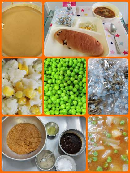 ビーフシチュー カリフラワーとコーンのサラダ ミニフィッシュ ぶどうぱん 牛乳