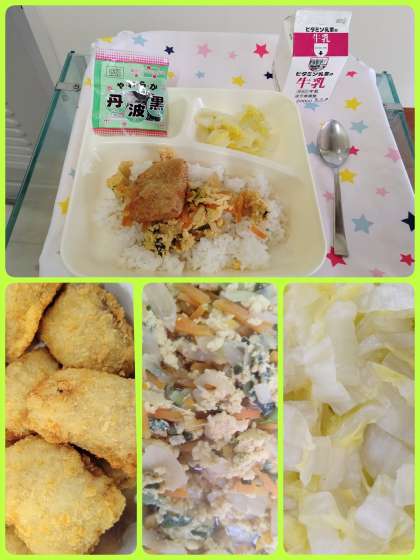 『カツ丼』は、児童に人気の献立です。この献立は、【鶏卵(液卵)】の個別対応献立です。鶏卵を除去した具を保温ポットに入れて配缶し、教室でごはんにかけて食べます。『はくさいの甘酢あえ』は、さっぱりとした味つけで美味しかったです。