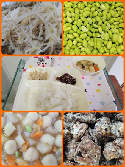 『くじらのたつたあげ』は、一年に一回登場する献立です。くじらの肉はやわらかく、しっかりとした味つけでした。『まる天と野菜の煮もの』は、まる天を主材に、じゃがいも、だいこん、玉ねぎ、などを使用した煮ものです。ごはんによく合う献立で美味しかったです。